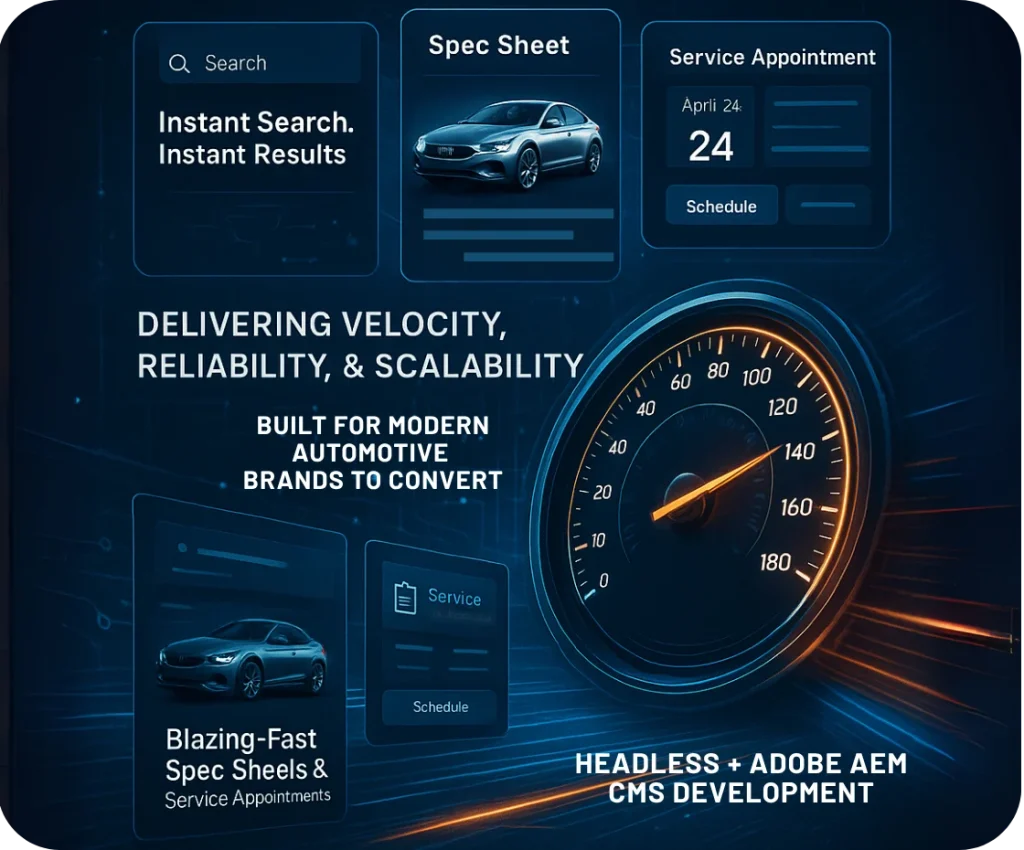 Speed Up Every Click, Load, and Lead. From search to spec sheets to service appointments, your buyers expect it all instantly. Our headless and AEM-powered CMS delivers the velocity, reliability, and scalability that modern automotive brands need to convert.